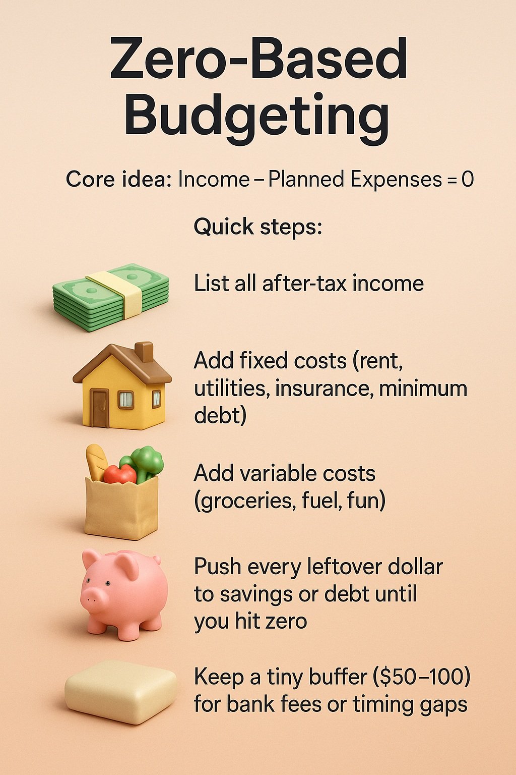 Zero-based budgeting gives every dollar a job before the month begins. Income minus planned expenses equals zero. That includes savings, investing, and debt payments. Starting with this framework keeps money from “escaping” into impulse buys.