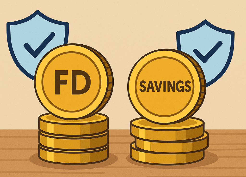 • DICGC insurance covers both products equally; each bank account (savings or FD) is insured up to ₹5 lakh. To protect balances beyond ₹5 lakh, split deposits across different banks.